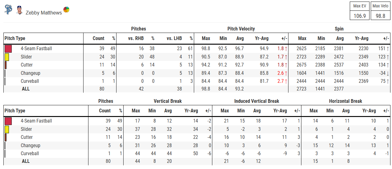 In Matthew's first two starts for Triple-A St. Paul this season, he's allowed just five hits, two earned runs, and one walk in 10 innings while striking out 13 batters, including nine in his last outing. Matthews's velocity has been up across the board as well this season, jumping between 1.7 and 2.7 mph on each pitch type in his last outing.