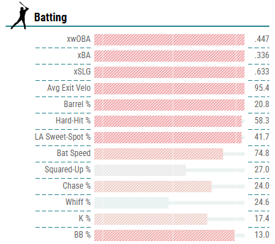 The right-handed slugger hit .275 (14-for-51) in games in which he started (0-for-4 as a pinch hitter), belting five home runs in his limited action while registering a 17.5 percent barrel rate and an average exit velocity of 95.4, both of which would have put him among the league leaders in those statistics had he played enough games to qualify.