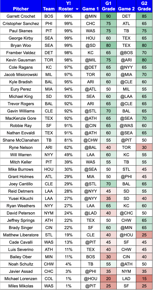 This chart is updated as probable starters are constantly changing with postponements, injuries, etc. Scroll down further for a color-coded chart.