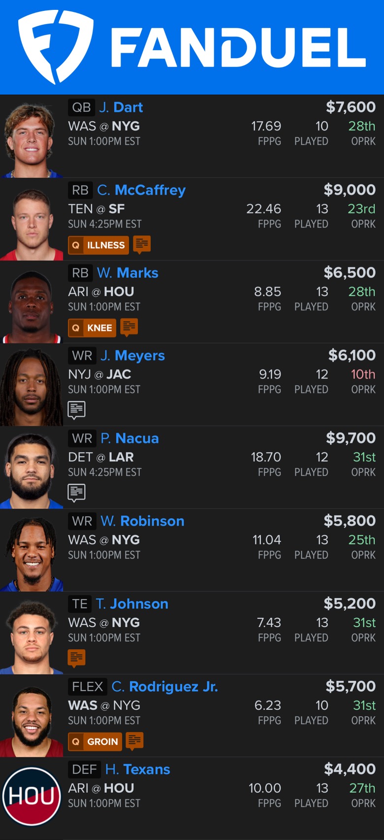 FanDuel: McCaffrey-Marks-Nacua