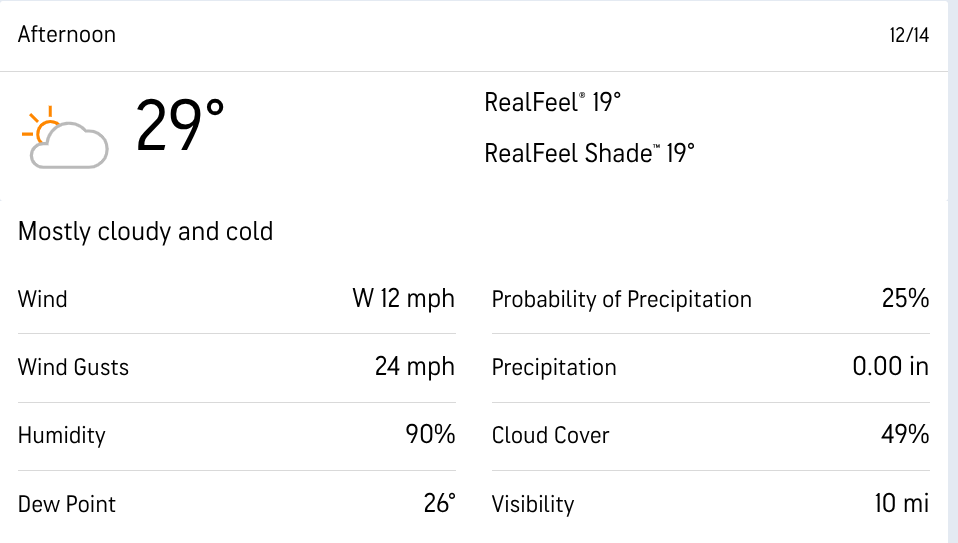 We have similar weather to the above in Philly when the Commanders travel to East Rutherford, NJ, to take on the Giants. While it will snow a little in the morning, it is not expected to impact the game. Temperatures will be in the mid-30s under cloudy skies. Additionally, wind gusts will only push 15 mph.
