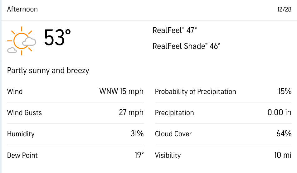 AccuWeather currently has temperatures listed in the mid-40s under partly cloudy skies. Sustained winds are expected to be around eight mph, with gusts near 21 mph. Start your studs in this one.
