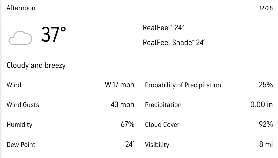 As expected, it will be extremely cold, with temperatures expected to be in the teens. Additionally, there could be some rain and ice mix falling. Wind gusts are also expected to be near 25 mph, so we are just looking nasty all the way around in this one.