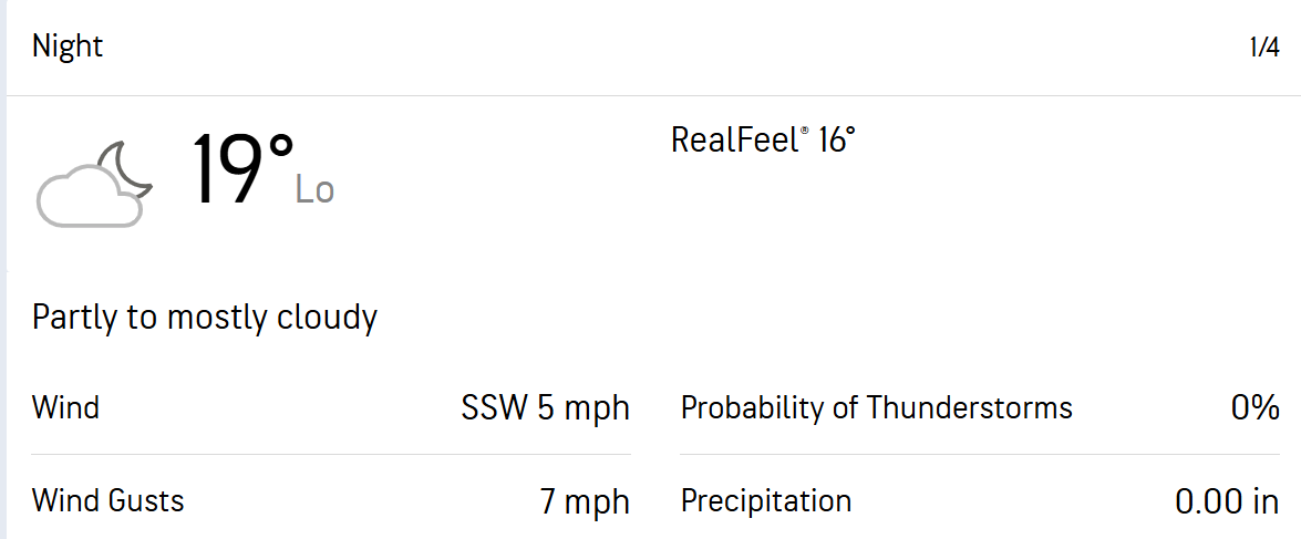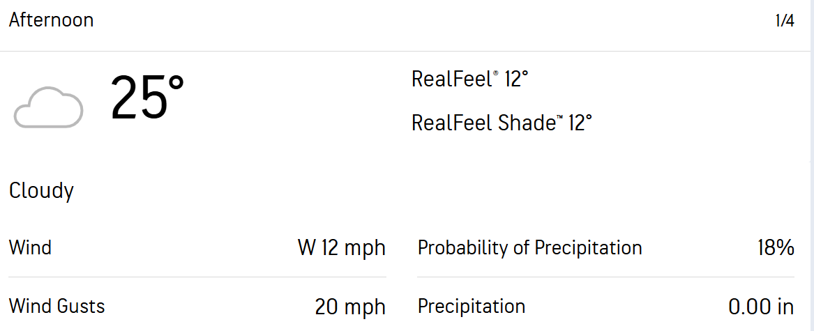 As expected, it will be cold, with temperatures in the mid-20s. Skies will be mostly sunny, and sustained winds are projected to be around nine mph with gusts near 13 mph. There are no real concerns here, so start your studs as you normally would.