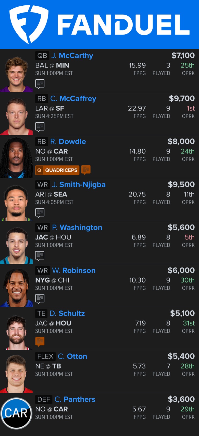 FanDuel: McCaffrey/Dowdle/JSN/Parker Washington