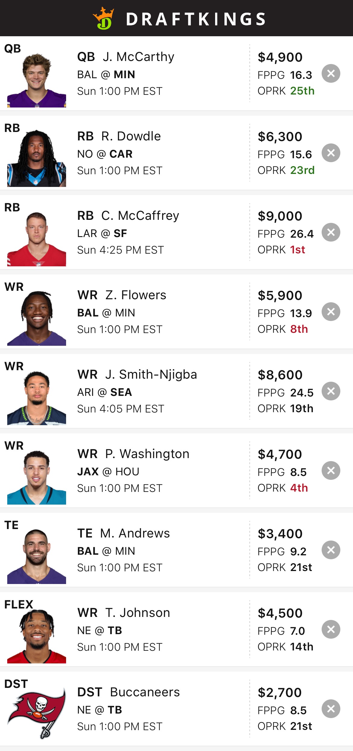 DraftKings: McCaffrey/Dowdle/JSN/Flowers