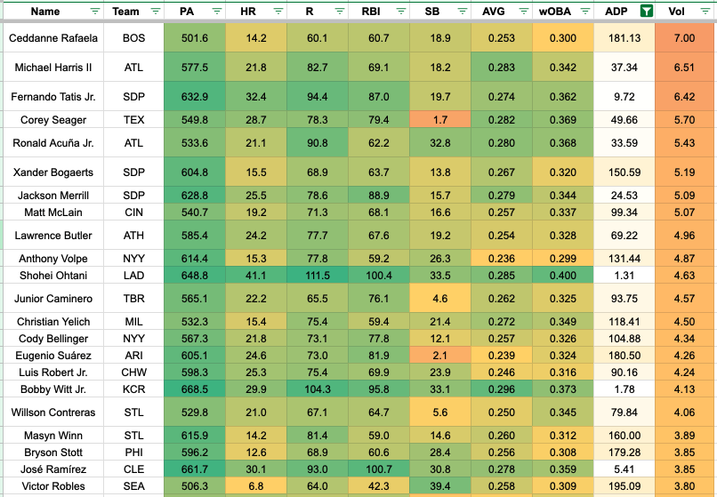In 2025, Ariel has renamed the metrics to Vol as the new InterSD. In the visual above, we see the hitters with the highest InterSD or Vol, suggesting the projections in ATC disagree on the player's value.