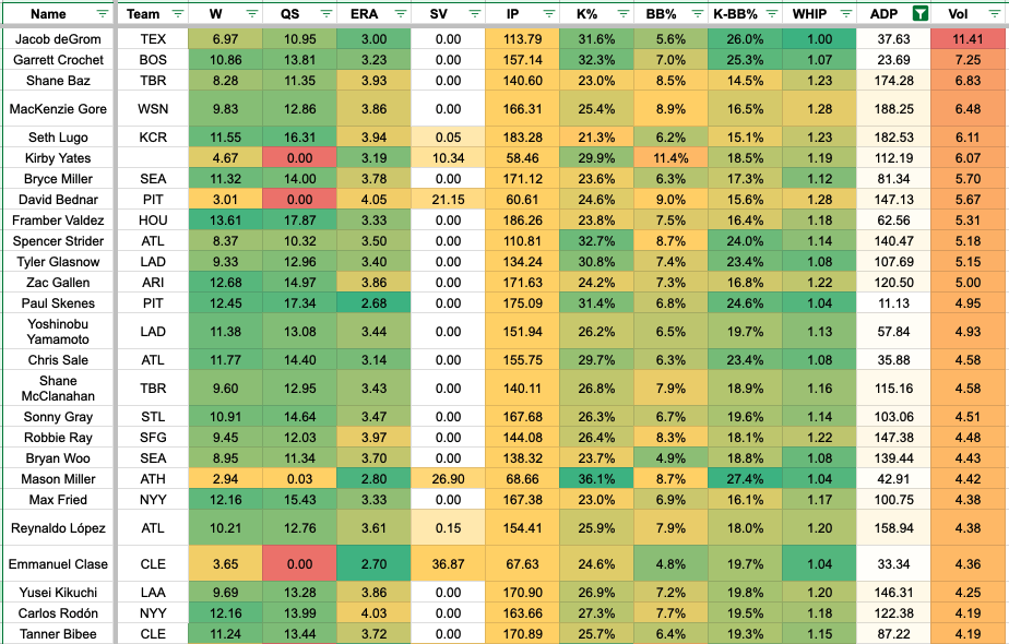 The pitchers with the highest Vol have several pitchers with injury concerns, aligning with the projection variance. Among starting pitchers, those pitchers include Jacob deGrom, Garrett Crochet, Shane Baz, MacKenzie Gore, Seth Lugo, Bryce Miller, Framber Valdez, Spencer Strider, and Tyler Glasnow.