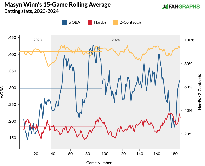 The power skills will lag with a 78 xPX and 2.8 percent barrels per plate appearance rate in 2024. Winn's strong plate discipline skills balance out the below-average power output. As a shortstop with a strong arm and 84th percentile Outs Above Average, Winn possesses the speed to steal 10-15 bags, which would be the floor.