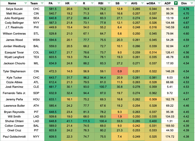 That's evident in seeing Seiya Suzuki, Matt McLain, Julio Rodriguez, Cody Bellinger, J.T. Realmuto, Willson Contreras, James Wood, and Jordan Westburg among the hitters with the highest Dim. Theoretically, these hitters should provide power, speed, batting average, and juice across multiple categories.