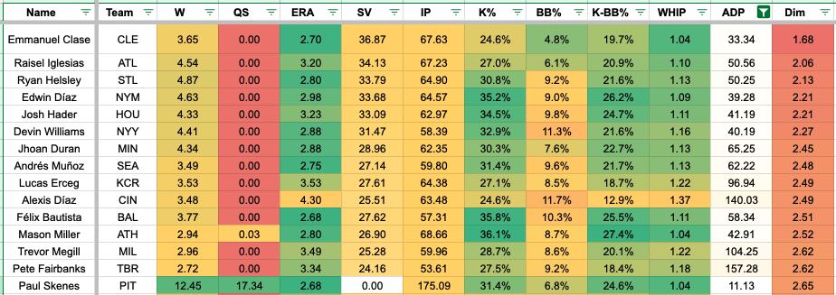 The only reliever of note with the highest Dim was Michael Kopech, though it's likely because of the wins, saves, and strikeout projections. It's worth noting that Kopech's ADP is a middle-round pick near 190, so the risk is built into the cost with the additions of Kirby Yates and Tanner Scott in January 2025.