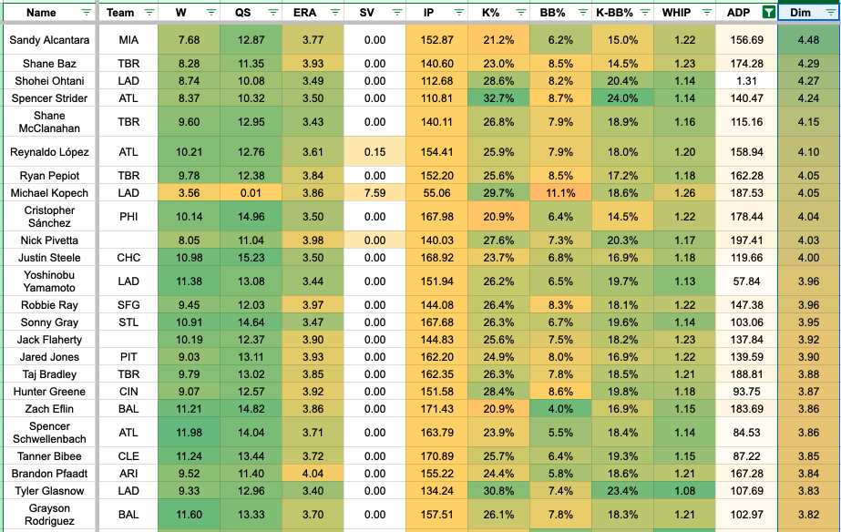 Meanwhile, the pitchers with the highest Dim have polarizing names. The list includes Sandy Alcantara, Baz, Shohei Ohtani, Strider, Shane McClanahan, and Reynaldo Lopez inside the top 200 picks. Besides Lopez, the rest of those pitchers have significant injury and workload concerns in 2025, though we can't deny the skills when healthy.