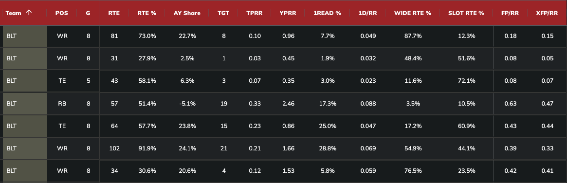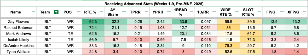 Lamar Jackson returned in Week 9, providing optimism for the Ravens' offense. Flowers leads the team in air yards share (32.3 percent), first-read target share (33.6 percent), and yards per route run (2.42) among Ravens' pass catchers with a 50 percent route participation or higher.