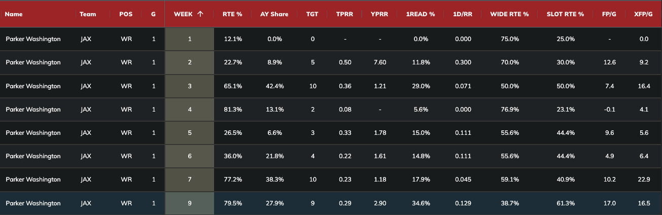 Washington's usage suggests better production. That's evident in Washington's higher expected fantasy points than the actual outcomes, though that seems to be a trend for the entire Jaguars' pass catchers. We've seen Washington's usage increase over the past two weeks, which makes us wonder why we might be downgrading him in Week 10.