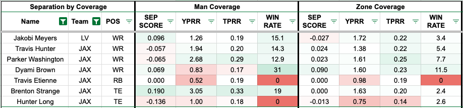 Washington leads the team in target rate against zone coverage, while averaging 1.61 yards per route run. Meyers, their new addition, can also produce against zone coverage, though there might be some overlap in their skill sets.