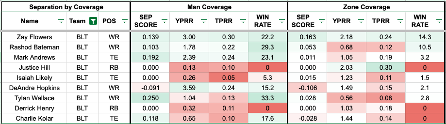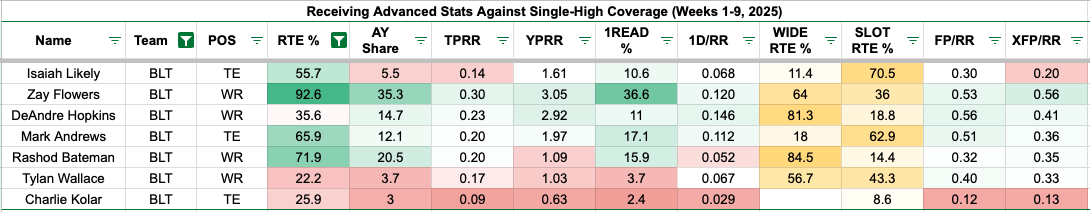 Specifically, against single-high coverage, Flowers boasts a team-high 30 percent target-per-route rate while generating over 3.00 yards per route run (3.05). Hopkins, Rashod Bateman, and Mark Andrews were the only other Ravens' pass catchers with five or more targets against single-high looks. Andrews might be the most notable option, garnering a 20 percent target rate and 1.97 yards per route run. That's mainly because Hopkins' usage seems to be unreliable.