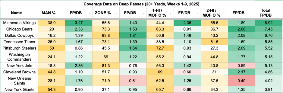 The Vikings' pass defense ranks 24th in team coverage grade. Isaiah Rodgers has been middle of the pack, allowing the 30th-most fantasy points per dropback and 20th-highest yards per route run. We discussed this in the Week 9 WR/CB Matchup article, but the Vikings' defense allows the most fantasy points per dropback on deep passes of 20 or more yards.