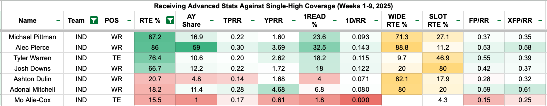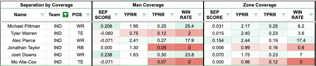 The Falcons' defense has been relatively beatable against zone coverage, which surprisingly favors Pierce, who leads the team in yards per route run, Average Separation Score, and win rate. Meanwhile, Tyler Warren (23 percent), Michael Pittman (25 percent), and Josh Downs (23 percent) have been leading the team in target rate against zone.