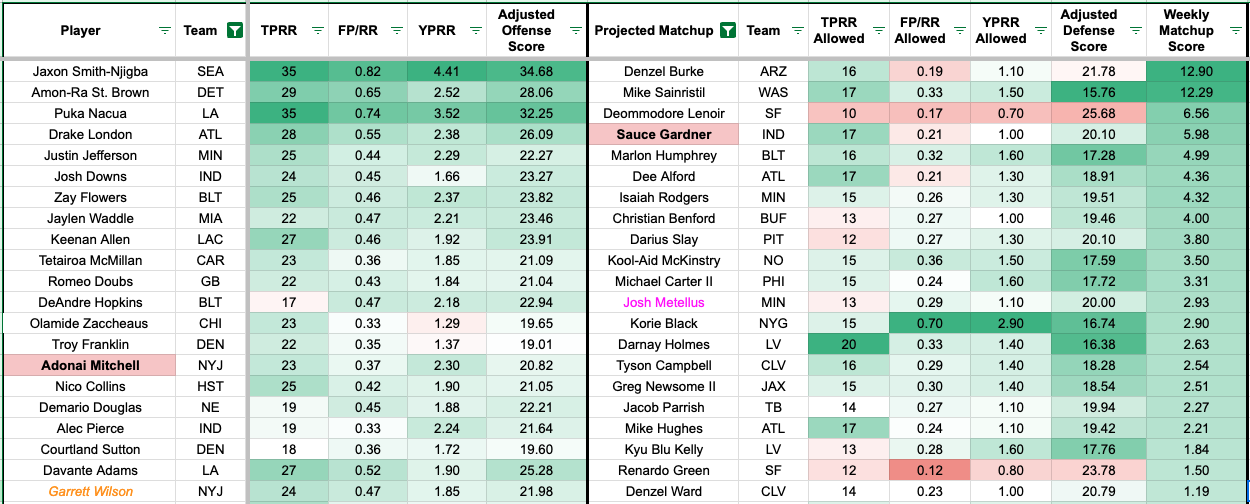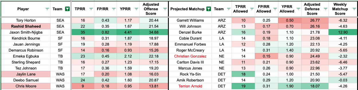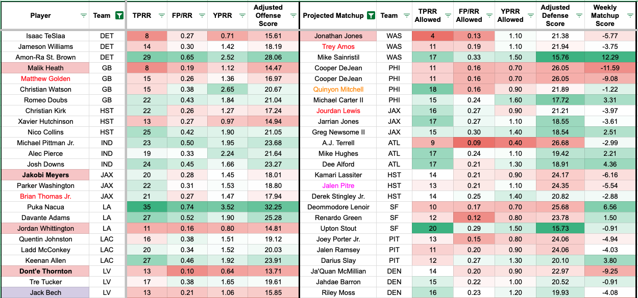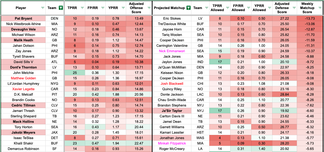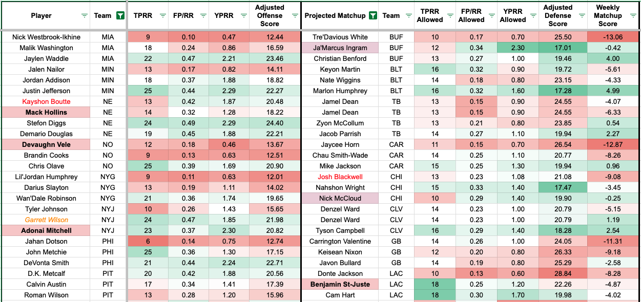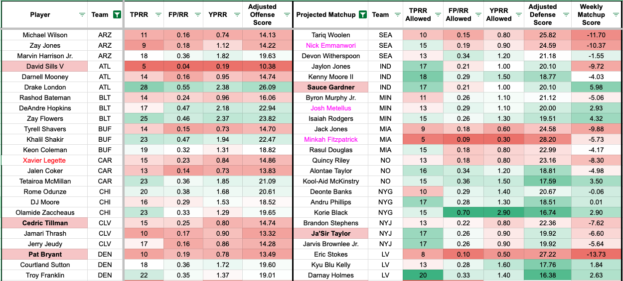 We added additional team-level metrics to the formula to account for team context. The red numbers indicate a more challenging matchup for the receiver, and the green numbers mean favorable matchups (or the defender allows a high rate of the given metric).