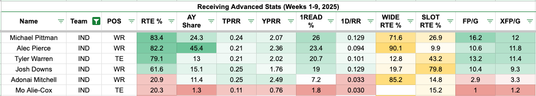Pierce had a career-high in targets (13) in Week 9 after 10 in Week 7. However, that was also an outlier game against the Steelers because Daniel Jones attempted a pass 50 times in Week 9, compared to 30.4 in Weeks 1-8. That said, Pierce continues to run a high percentage of routes while being their downfield threat.