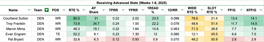 Franklin has been matching Courtland Sutton in air yards shares and first-read targets. However, Franklin's usage suggests better production, and we saw glimpses of it this year. Franklin has been the primary slot receiver for the Broncos, and that's typically a matchup to target against Darnay Holmes.