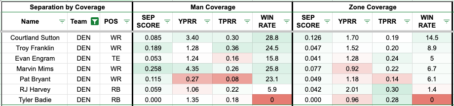 Sutton bests Franklin in yards per route run, but they both have a similar target per route rate against zone coverage. The Broncos have been scheming up RJ Harvey with a team-high 30 percent target rate and 2.01 yards per route run against zone coverage.