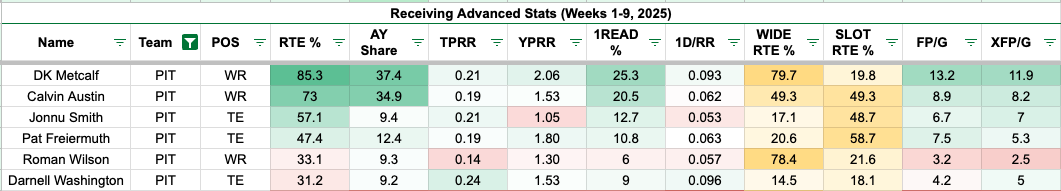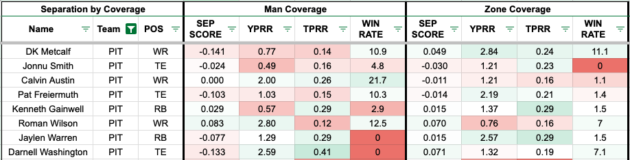 Metcalf has been sneakily producing a team-high 2.84 yards per route run against zone coverage, ahead of Jaylen Warren. Typically, we find tight ends and running backs with better numbers against zone, though Metcalf has shown he can win against man coverage in the past.