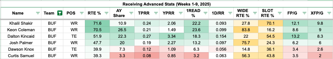 Shakir ranks second behind Dalton Kincaid in target per route rate, with a nearly identical first-read target share to Keon Coleman. Based on Shakir's usage, he has been one of the more efficient pass catchers, averaging over two fantasy points above expectation.