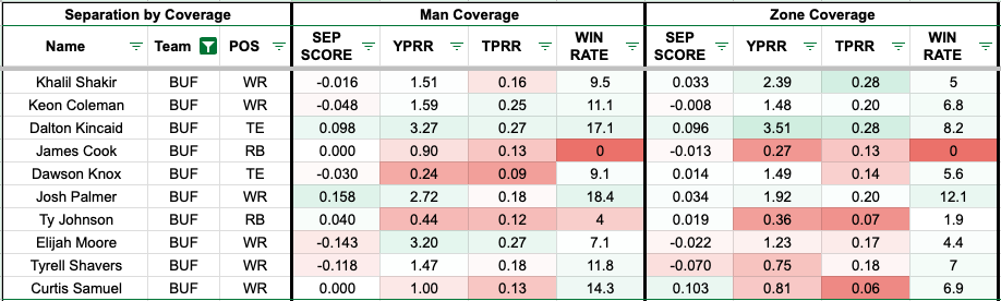 Kincaid leads the Bills' pass catchers in yards per route run while tying Shakir in target rate (28 percent) against zone coverage. Wildly enough, Kincaid leads the team in yards per route against man coverage while besting Coleman in target rate, making it a friendly matchup for the tight end.