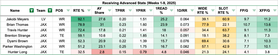 With Travis Hunter on injured reserve and Brian Thomas Jr. potentially missing time, Parker Washington automatically becomes one of their top pass catchers. The Jaguars added Jakobi Meyers and can't wait for Brenton Strange to return soon. Add in Dyami Brown's concussion late in Week 9, and the Jaguars will be digging into their depth.