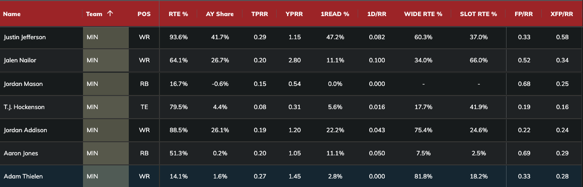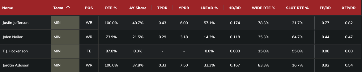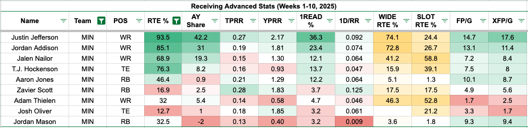 The visual above shows the Vikings' receiving usage in Weeks 9 to 10. Over the past two weeks, Justin Jefferson has led the team with a 47.2 percent first-read target share, with Addison ranking second at 22.2 percent. Jalen Nailor leads their top three receivers in yards per route run in Weeks 9-10, but that might not be sustainable. The visual below shows the season-long leaders in the Vikings' receiver advanced stats.