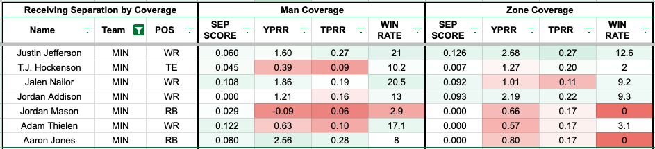 Jefferson leads the Vikings in target rate against man and zone coverage. Addison has been struggling to produce against man coverages, but averages the second-most yards per route run while garnering the second-highest target rate versus zone. The Bears' pass defense has specifically been shredded on deep targets.