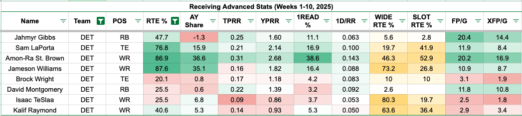 One way to quantify players that tend to be volatile and somewhat better in bestball includes looking at their expected fantasy points versus FPOE/G. Williams ranks 66th in expected fantasy points yet boasts the 10th-most efficient in FPOE/G. The Lions' offense has been one of the most efficient, ranking first in EPA per pass attempt and ninth in rushing yards per play.