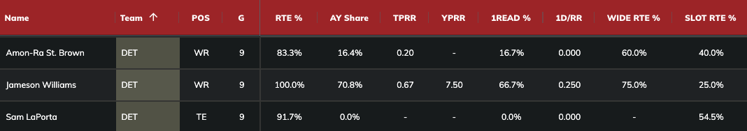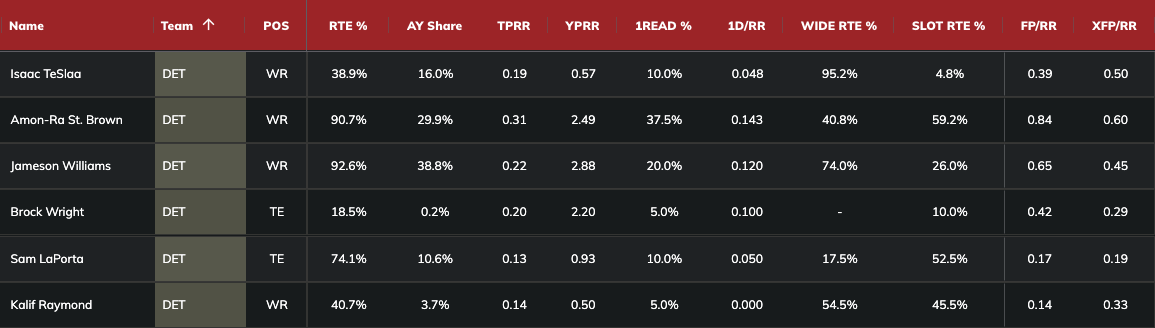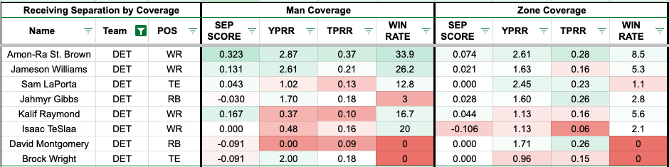 The Lions have multiple pass catchers who can win against man coverage, including St. Brown and Williams, who rock high win rates and near-elite yards per route run. It might be a matchup where it's strength against strength for Williams and the Eagles' pass defense.