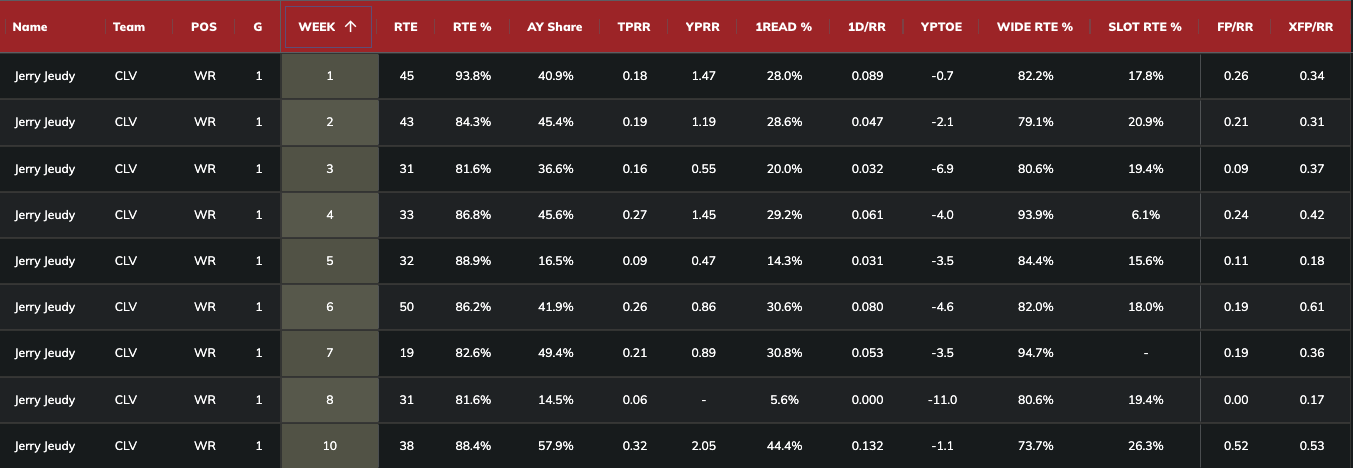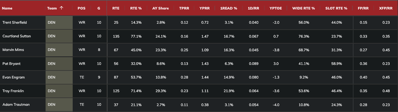 Jeudy has one of the most inefficient receivers, specifically in FPOE/G, ranking second-worst, ahead of Mike Evans and behind Darnell Mooney. Week 10 marked Jeudy's first game with over 2.00 yards per route run, and it was his second-best in yards per target over expected (YPTOE).