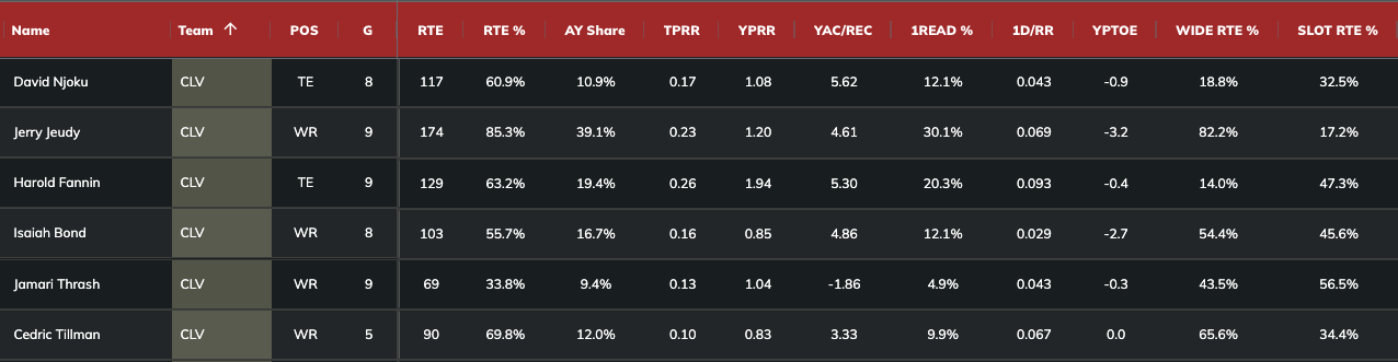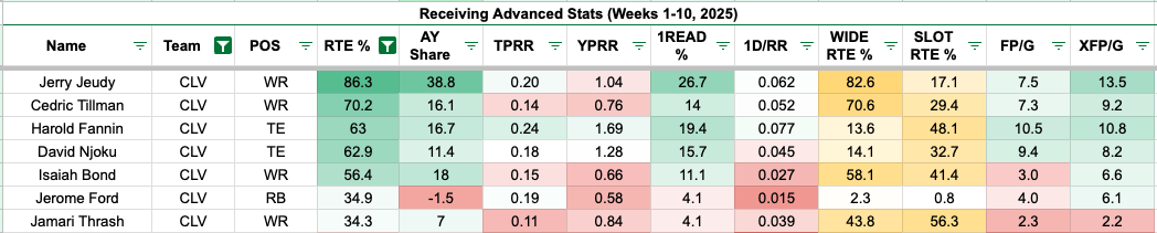 Jeudy leads the Browns' pass catchers in air yards share (38.8 percent), first-read target share (26.7 percent), and expected fantasy points per game. Cedric Tillman returned from injured reserve in Week 10 due to a hamstring injury. Tillman ran a route on 67.4 percent of the team's dropbacks in Week 10, though Harold Fannin Jr. continued to be second in first-read targets.