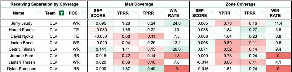 Fannin has been the Browns' best pass catcher in yards per route run against man and zone coverage. However, Jeudy leads the team in target rate (24 percent) against man coverage, ahead of Fannin (22 percent), besides Dylan Sampson's wild small sample. Where Jeudy can win tends to be against single-high coverages.