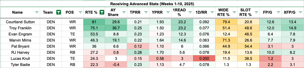 The talk each week surrounds how Troy Franklin's usage has arguably been better than Sutton's. Franklin bests Sutton in expected fantasy points per game, while Franklin garners a team-high 36.7 percent air yards share, yet they have an identical first-read target share.