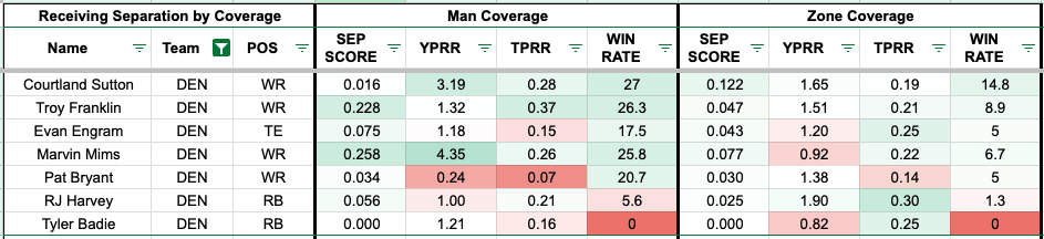 That's typically how the Broncos' offense attacks two-high coverage. Evan Engram, Fraklin, and Mims garner a target rate at 20 percent or higher versus two high. Sutton garners a lowly 16 percent target rate and produces 1.47 yards per route run.