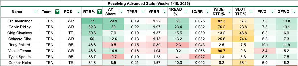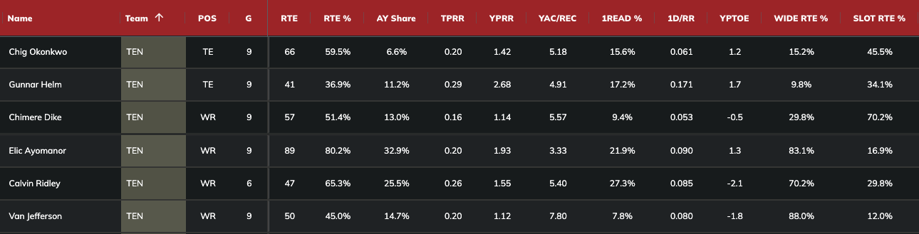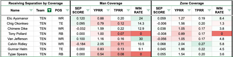 The Texans' defense deploys zone coverage at the sixth-highest rate while giving up the fourth-fewest fantasy points per dropback. Their tight ends have been the best producers against zone coverage, as seen below. Okonkwo produces 1.56 yards per route run, with Gunnar Helm at 1.86. If Calvin Ridley returns, he would be the Titans' best pass catcher against zone coverage.