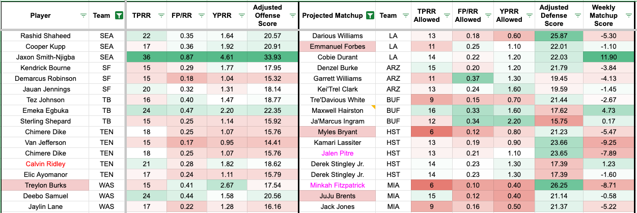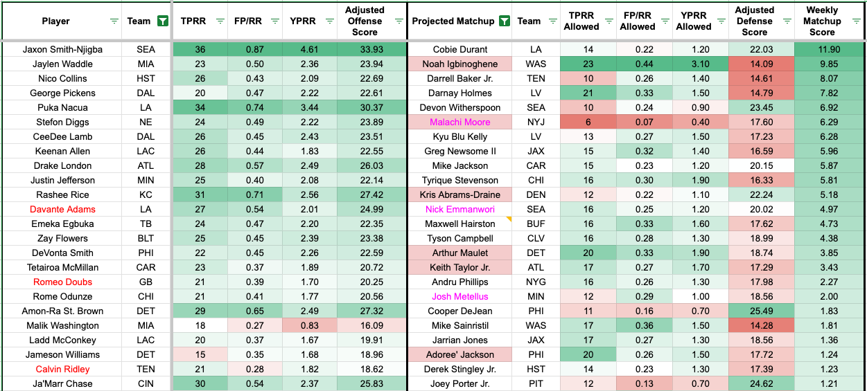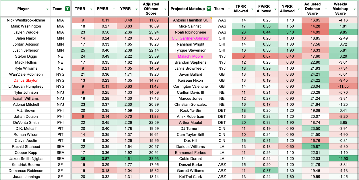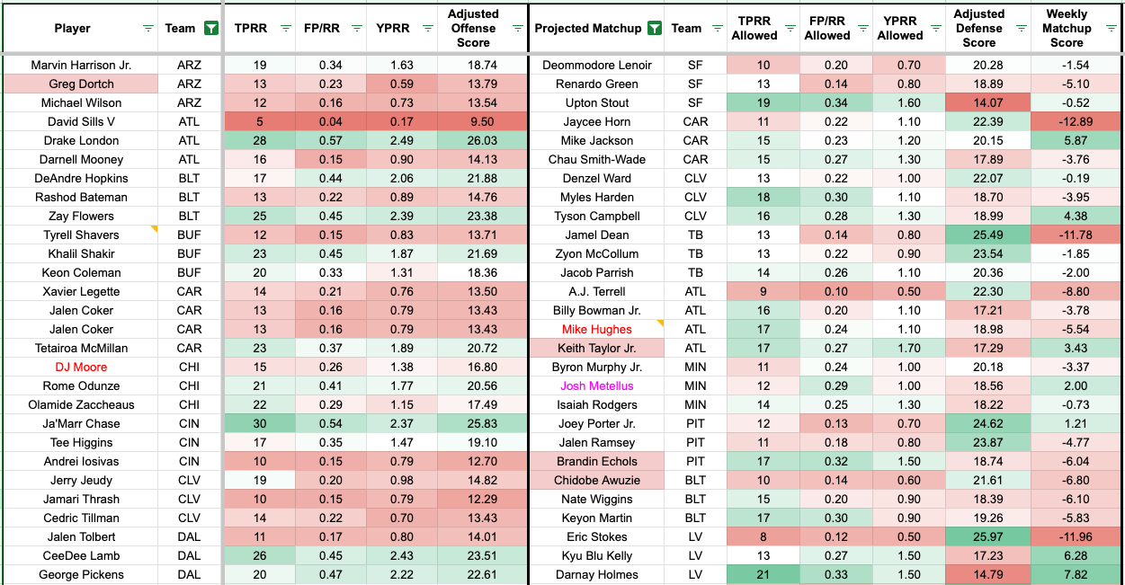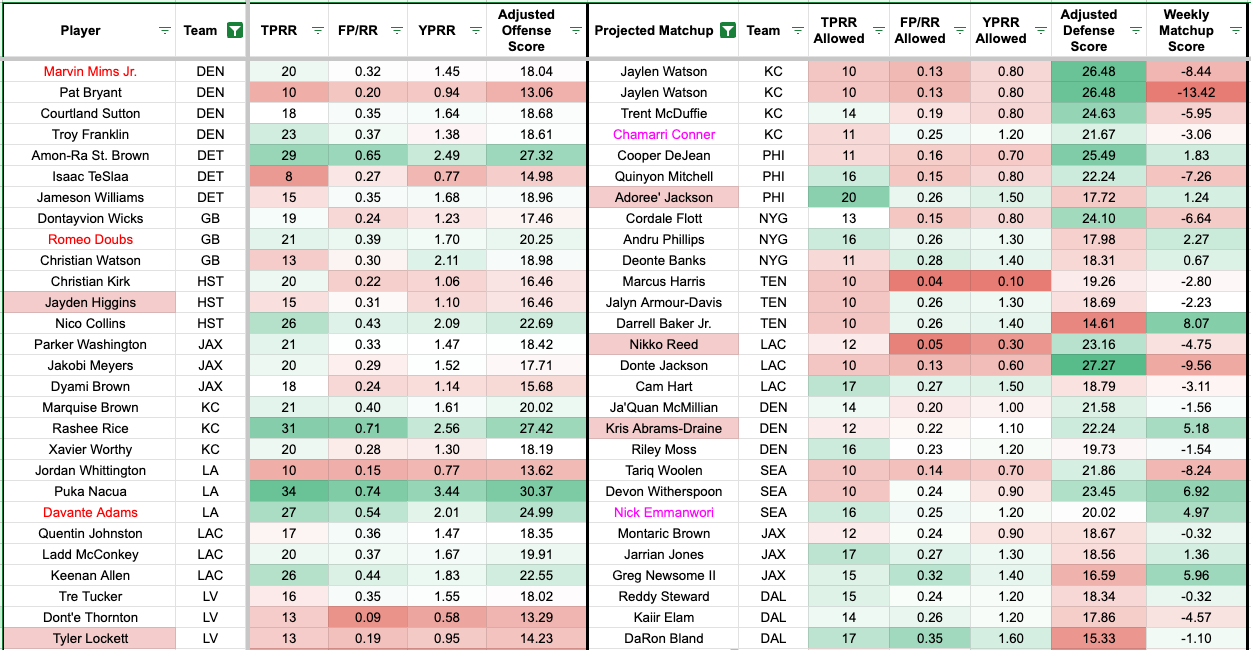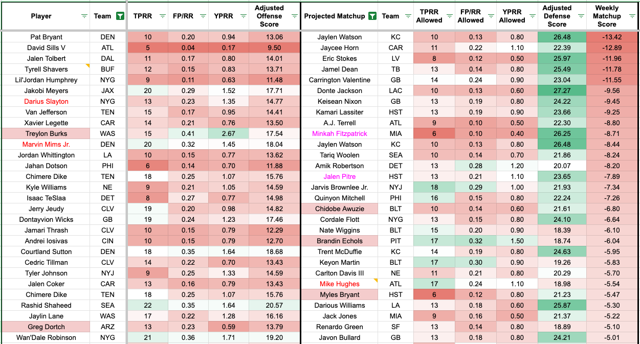 We added additional team-level metrics to the formula to account for team context. The red numbers indicate a more challenging matchup for the receiver, and the green numbers mean favorable matchups (or the defender allows a high rate of the given metric).