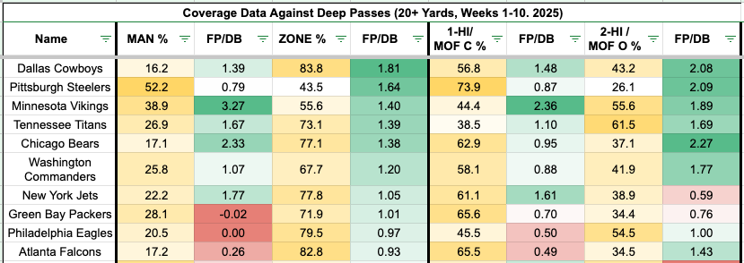 The Eagles' pass defense allows the lowest fantasy points per dropback on deep passes when using man coverage. However, they shift to be more zone-heavy (No. 8) against deep passes while being susceptible to giving up the ninth-most fantasy points per dropback.