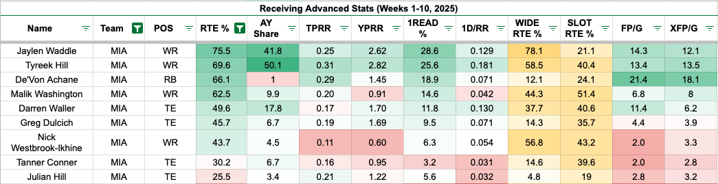 Without Tyreek Hill, Waddle has been averaging just under 16 fantasy points per game (PPR) from Weeks 5-10. Interestingly, Waddle has been efficient, boasting 4.6 fantasy points over expectation (FPOE), the eighth-highest FPOE among receivers that played in two or more games since Week 5.