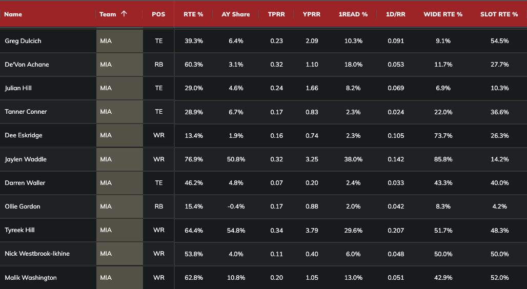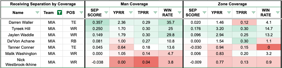 Among the Dolphins' healthy pass catchers, Waddle leads the team in yards per route run with a high-end 30 percent target rate against man coverage. Waddle can win against man coverage, especially with the Commanders having multiple injuries in the secondary. Waddle has been the Dolphins' top zone beater, posting an above-average 2.94 yards per route run and a 25 percent target rate against zone coverage.