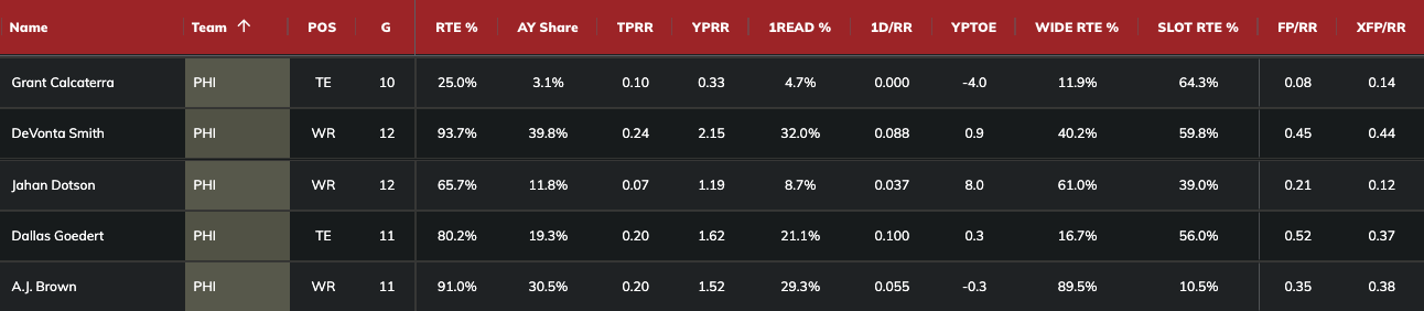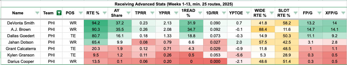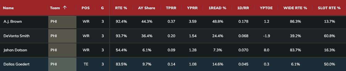 When we filter by two-high looks across the season, Smith (32 percent) and Brown (29.3 percent) have similar first-read target shares. Smith leads yards per route run (2.15) against two-high looks, with Brown (1.52) and Dallas Goedert (1.62) close behind. We provide that context because Smith and Brown have been two of the top target earners, regardless of coverage.