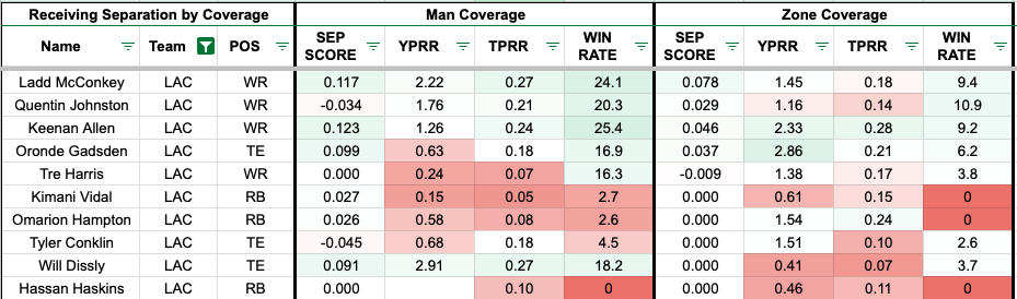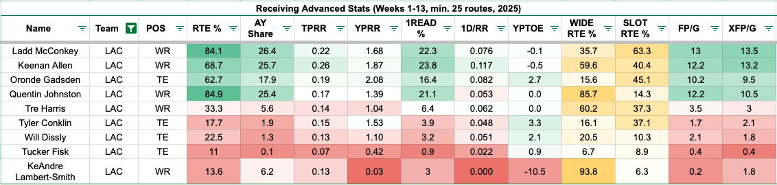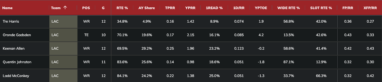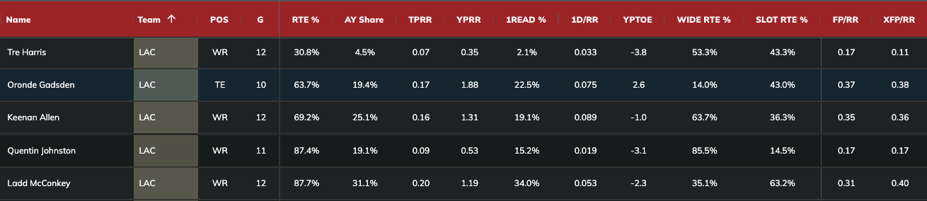 When Herbert faces pressure, he tends to look toward Ladd McConkey as his first read 34 percent of the time, with a team-high 20 percent target rate. Johnston remains the fourth option in target per route rate (9 percent) and first-read target share while producing a lowly 0.53 yards per route run.