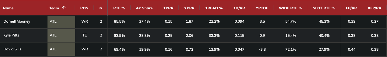Without Drake London over the past two weeks, Mooney was second among the Falcons' primary pass catchers in yards per route run (1.87) and first-read target share. Mooney led the team in air yards share, yet Kyle Pitts Sr. was the primary target earner over the past two games.