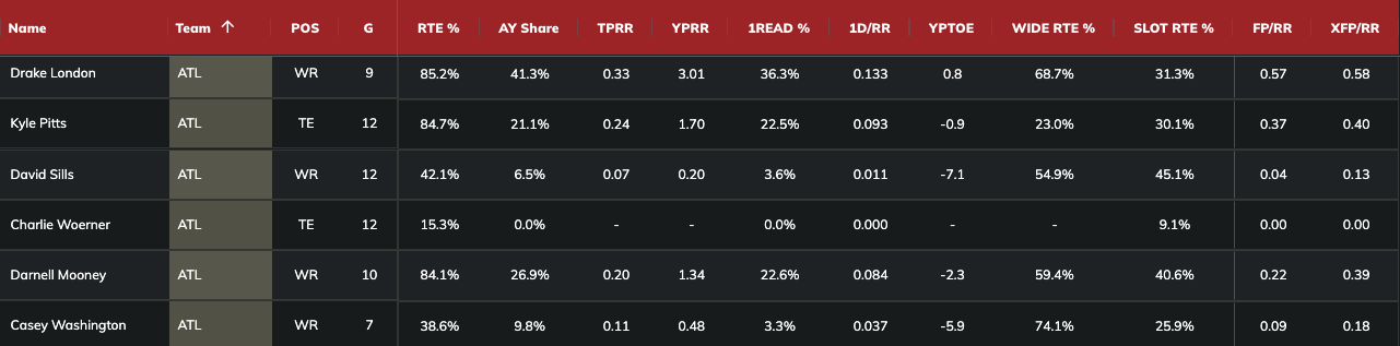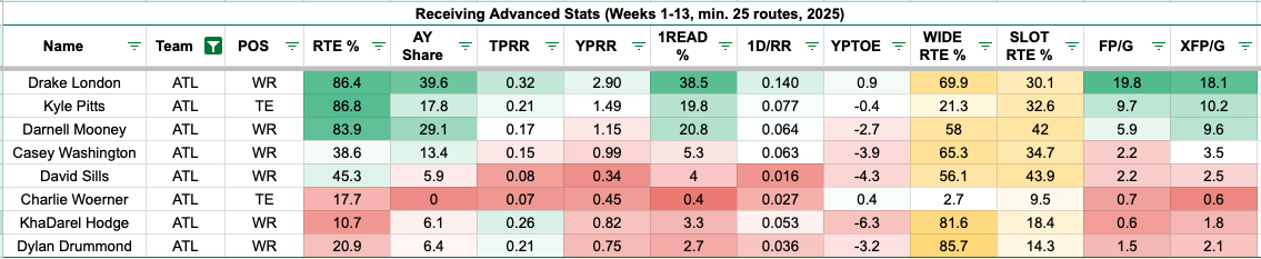 London is an elite talent and target earner, while Mooney tends to be used like a WR3 or WR4, with potential regression in his favor. We can't stress how much Pitts has been used as a pass catcher in 2025, acting like the second or third-best pass catcher, not including Bijan Robinson.