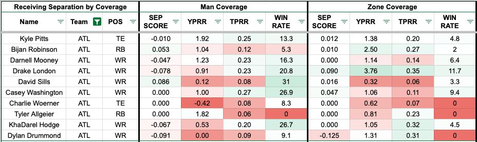 London and Robinson lead the Falcons in yards per route run and target rate against zone coverage. Mooney has been brutal against man (1.23) and zone (1.14) in yards per route run, yet targeted at a lower rate (14 percent) versus zone coverage. When we filter by single-high coverages, Mooney garners a 20 percent target rate, 22.6 percent first-read target share, and 1.34 yards per route run, as seen below.