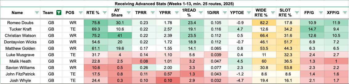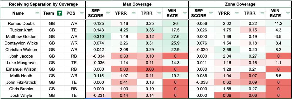 Watson leads the team with 2.39 yards per route run, yet only an 18 percent target rate and 20.4 percent first-read target share against two-high coverages. Besides Doubs's 25 percent target rate, 2.03 yards per route run, and 22.2 percent first-read target share versus two-high looks, Matthew Golden was the only other Packers' pass catcher averaging over 2.00 yards per route (2.27).